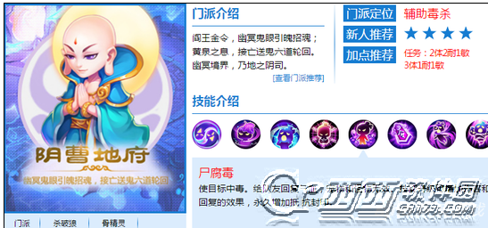 定位辅助。别的暂且不提,一个鬼眼的存在,在如今还没有感知变身卡的游戏中,使得地府不可或缺,至于六道轮回,改版之后提升不少,威力更强大了,优先级相对尸腐毒有所提高。修罗隐身也是PVE灭队翻盘的必备技能之一,还可以在压力不是很大的时候保护宝宝或者防止点杀,属于一个战术后备技能,使用频率不高但是不可忽视,秒人技能自带首目标六道,算是三个门派当中最好了,也没什么特别大优势。大招加强了几次,也越来越多的出现在擂台、武神坛等PVP舞台,有待开发。
