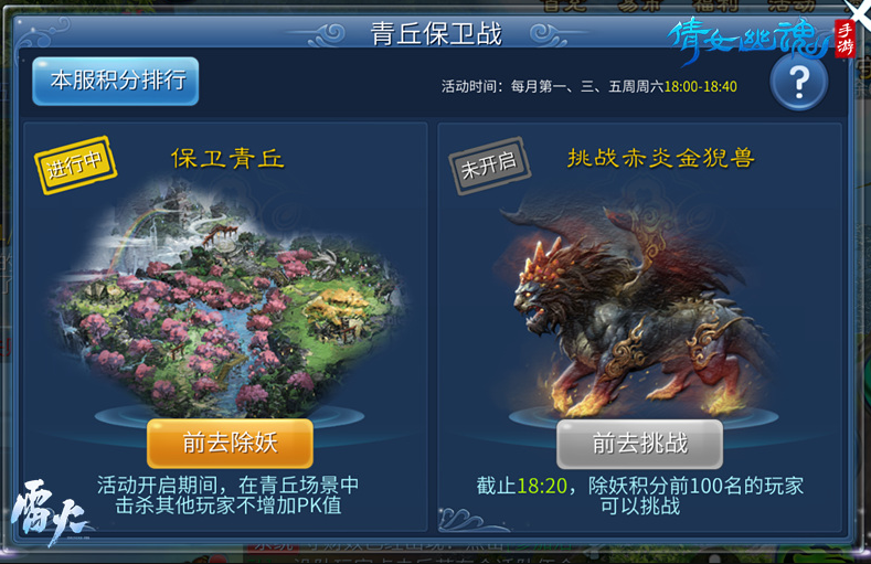 玩家组队加入【青丘保卫战】,击败汹涌而来的狼妖,不仅能获得大量经验和奖励,还能获得除妖积分,积分靠前的玩家将拥有挑战赤炎金猊兽的机会!成功击退妖兽,有几率获得积分,使用积分可以将赤焰金猊兽收复为坐骑。