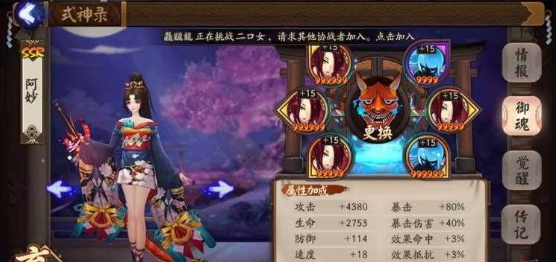 4、针女输出,选择:妖刀姬、酒吞童子、荒、荒川(不推荐吸血姬)