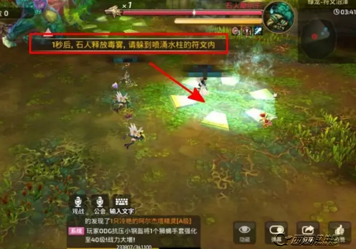 全屏毒雾:BOSS血量接近4X或者4X的时候,会释放第一次全屏毒雾,系统会出现字幕提示BOSS要放全屏毒雾了,同时开始5秒的倒计时,这时候地图中的5个符文区域,会有一个激活并且喷涌水柱,只有跑到这个激活的符文区域,才能免受伤害。