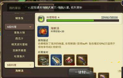 海鲜汤,料理经验+20,食物描述:仿佛喝到了海洋的味道,非常鲜美!获得buff:免伤增加10%(只适用于领地争夺战),持续1天。