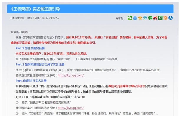 《王者荣耀》官方为了防止小学生长期玩《王者荣耀》,从 4 月 17 日开始要求未实名注册的QQ需要去填写姓名、身份证号。如果到 5 月份未完成实名认证的QQ就无法进入《王者荣耀》。