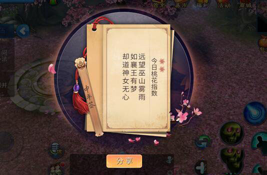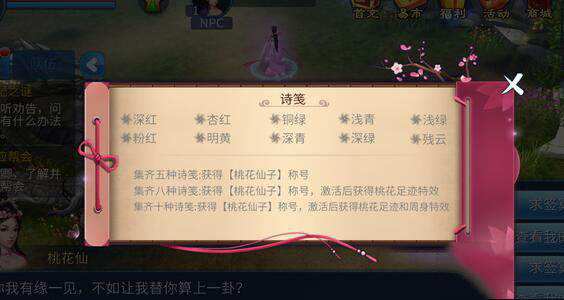 在桃花仙占卜活动中,完成占卜可以获得机缘丹,打开机缘丹可以获得诗笺(可以在npc处查看),一共有10种不同的诗笺,需要大家来收集哦。