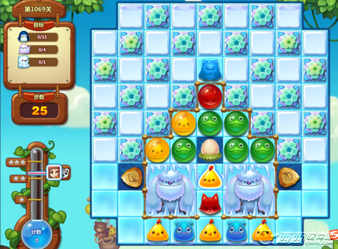 开心消消乐1069关又是丧心病狂大面积冰冻+雪怪的布局,1069关前期要把握好消除的顺序,顺利开局后面就简单了。下面就是西西分享给大家的开心消消乐1069关三星通关攻略,希望能帮助大家。