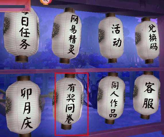 阴阳师下面一排的灯笼的内容有的时候是会变化的,调查问券的灯笼最底下的第二个就是有奖问卷灯笼了。