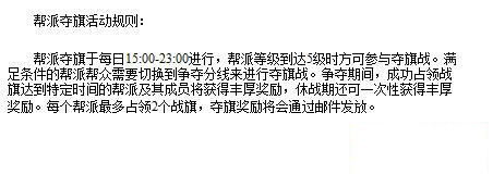 每天下午3点以后争夺旗,去争斗线可以夺旗,占领旗帜的公会,每2小时发放一次奖励,晚上11点夺旗结束,占领旗帜的公会发放一次性奖励,晚上11点到次日下午3点休战期,休战期间同样每2小时发放奖励,拿到旗帜的公会,福利还是很不错的。
