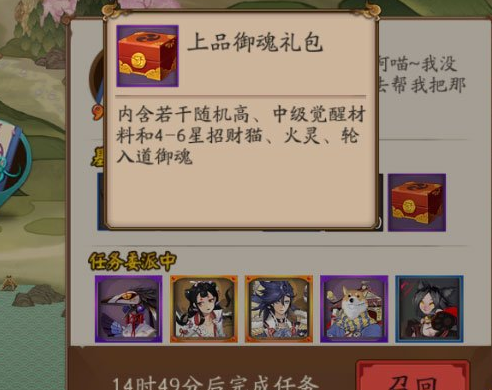 阴阳师里面上品御魂礼包不是通过购买才能获得的,而是做式神委派任务。