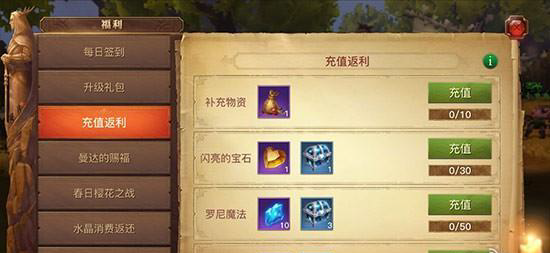 充值10:可领取物资礼包(必定得50000银币和500金币,有几率暴击出大量金币与魔法石)