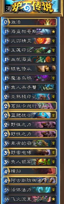 在针对牌方面,他使用的是1鱼人杀手蟹,1海盗杀手蟹的配置,也是属于比较中庸的配置方式。另外还加入了一张阿古斯,来针对一下速攻。