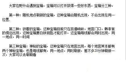 在百道峡岭或地宫门口等地方经常会看到锁着的宝箱,找到后需要用白铁钥匙来打开,钥匙是怪物掉落的,高级怪物身上可以出,获取难度并不大。