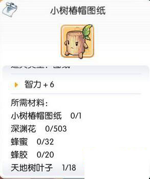 小树椿帽所需材料:1张小树椿帽图纸,503个深渊花,32个蜂蜜,20个蜂胶和18个天地树叶子。完成古城81级任务后找到商人即可购买图纸,解锁条件就是81级的任务。