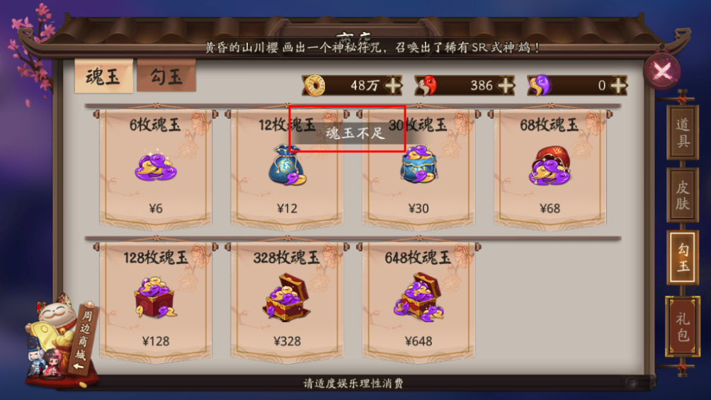 在商店右侧勾玉选项就可以看到魂玉的所在位置,不购买魂玉是无法购买礼包的。