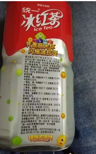 统一冰红茶兑换码获取途径:即日起至2017年9月30日,凡购买500ml统一冰红茶和1L统一冰红茶有“球球大作战”合作款包装的产品,打开瓶盖获取12位串码,并登录手机游戏“球球大作战”,点击“获取棒棒糖”通道,进入冰红茶专属抽奖界面兑换奖项设置,100%获取惊喜大奖;