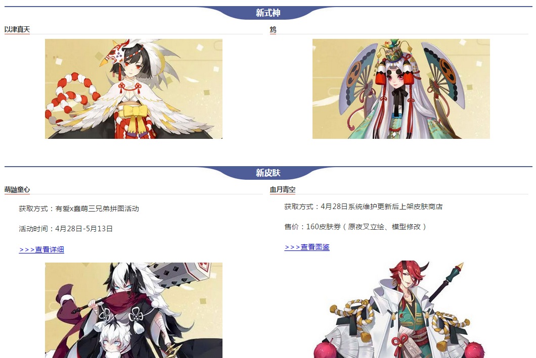 阴阳师手游在4月28日即将开启金羽之章版本,相信很多玩家都非常的期待,小编今天就为大家带来阴阳师手游4月28日金羽之章版本更新内容汇总,包括了新式神、新活动、新调整等全面的介绍和总结。希望大家喜欢。