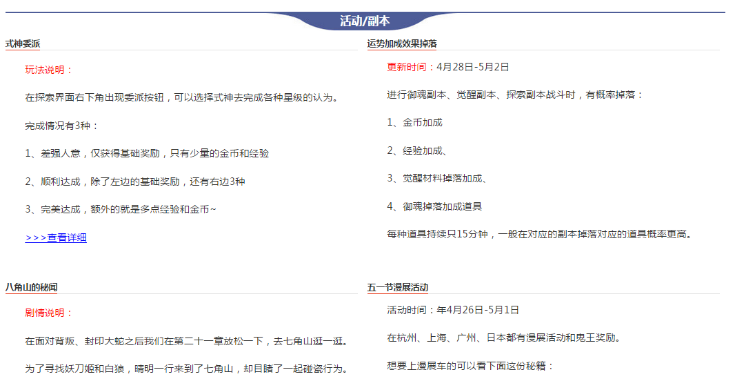 玩法活动:式神委派、 运势加成效果掉落、有爱x蠢萌三兄弟