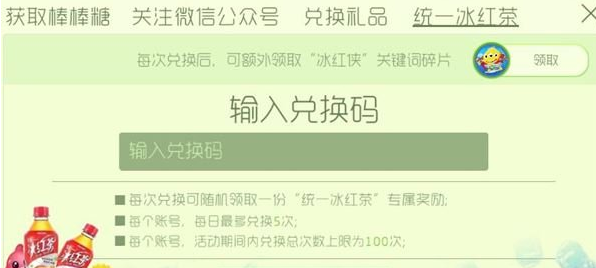 在球球大作战中,与统一冰红茶携手推出的全新活动开盖赢光环闪耀波拉哩来袭,那这个活动中,只要你打开瓶盖有12位数的兑换码,那就可以获得奖励,但是注意一点,那就是这个冰红茶的奖励兑换是有上限的:每个账号每日最多兑换5次,总次数上限是100次。