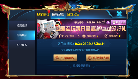 活动面板-限时活动里即可看到四个页签:萌新输入邀请码(只对新玩家开放),邀请新玩家,召回老玩家,积分兑换&排行榜,即为本次的四个主题活动!