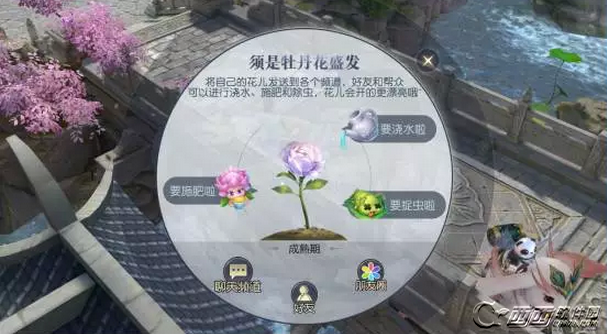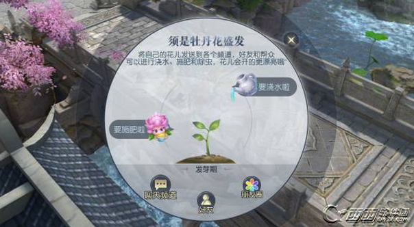 牡丹种子从中下到成熟收获,分为蛰伏期、发芽期和成熟期,每个阶段的种子都会有相应的成长需求,将自己的种子信息发送到世界频道、帮会频道或是好友,邀请好友为自己的种子解决“困难”,种子就会成长。