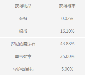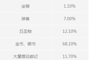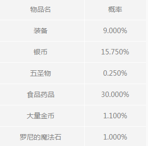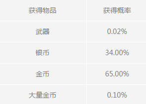 道具说明:使用后必定获得5万银币及500金币,初次以外,还可能获得下列奖励,概率单独结算,可能同时获得多组奖励