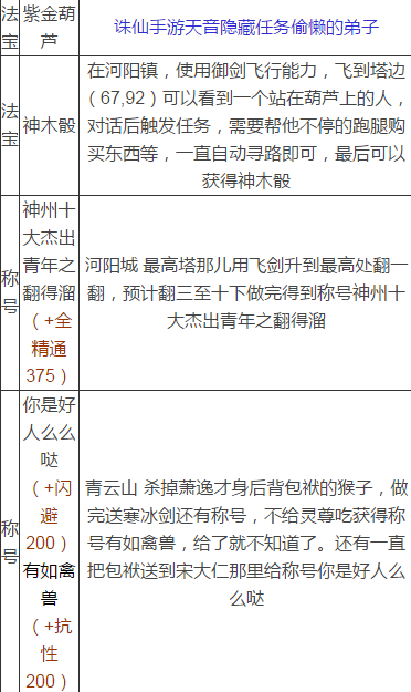 8、白衣少侠,青云,萧逸才大人的头顶上,升到最高翻滚一下。能够接取曾书书的隐藏任务,每个人的能触发的法宝是随机的,如果在空中翻滚没有反应,请落地更换法宝,小编换成慑心铃触发的,奖励1000金币。