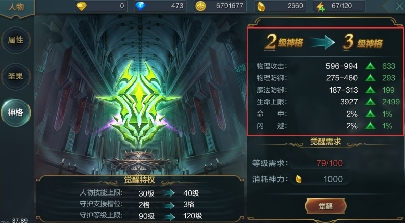 游戏中达到100级可提升神格,获得足够神力值即可觉醒神格,同时提升角色各种属性。