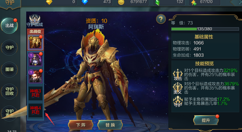 开启更高的神格等级后,守护支援位置也会相应开启,多携带一个支援守护将为角色提高巨大战斗力。