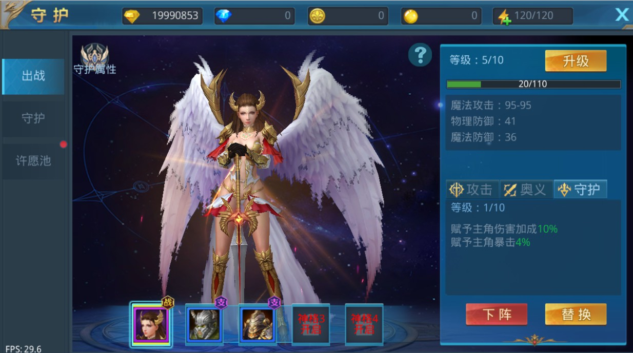 消耗守护之星和金币可以提升守护等级,守护等级上限与角色神格等级有关。