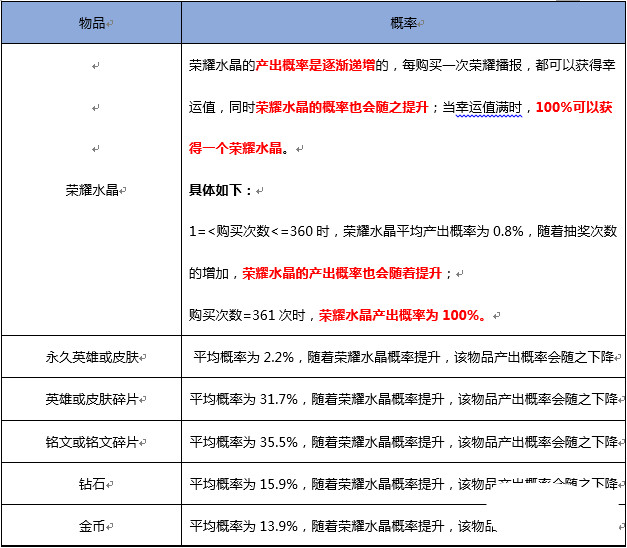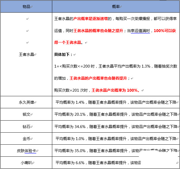 A “点券买荣耀播报”中,物品产出概率公布如下: