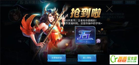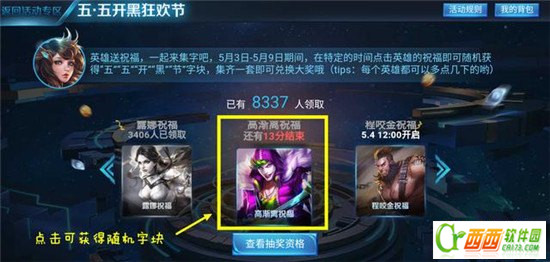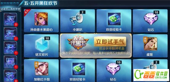 点击英雄头像随机获得“五”“五”“开”“黑”“节”字块,集齐一套后可以参与抽奖,并有机会赢得孙尚香皮肤——水果甜心