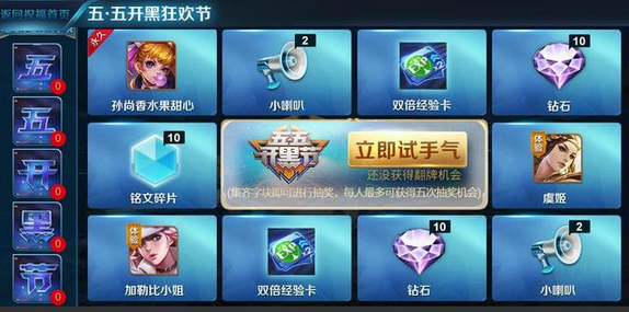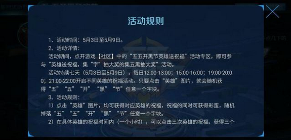 这是活动的规则说明,我给大家简单说一说,就是在这几个时间内可以去点击英雄图片,出现五五开黑节当中的一个字,集齐了就可以去抽奖,每个小时可以点3次哦,那么肯定很快就会集齐了的。