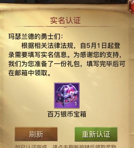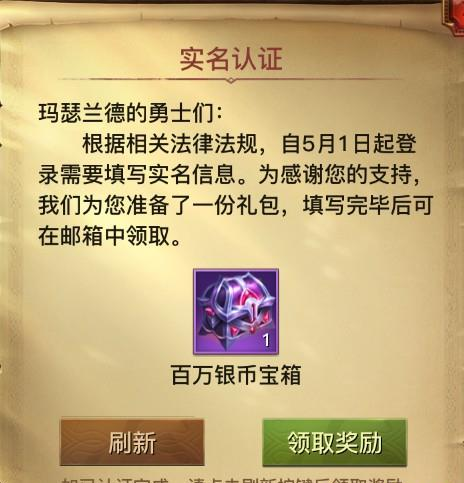 填写完所需信息后,点击“确认登记”,再返回游戏点击提示界面中的“刷新”!注意到了吗?之前显示为“前往认证”的绿色按钮变成了“领取奖励”按钮。