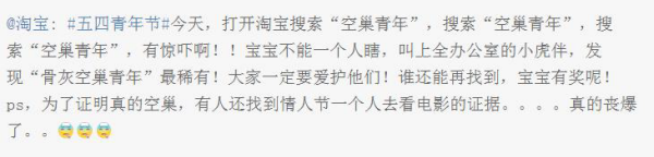 看到这里,各位“空巢青年”还不明白么?值此五四青年节,淘宝这是煞费苦心提供了一份脱单指南啊!要想脱离单身,目标锁定在90后,北上广深杭都可以,约人看演唱会要选择五月天、每个月定期充个手机费……淘宝也只能帮“空巢青年”到这儿了!