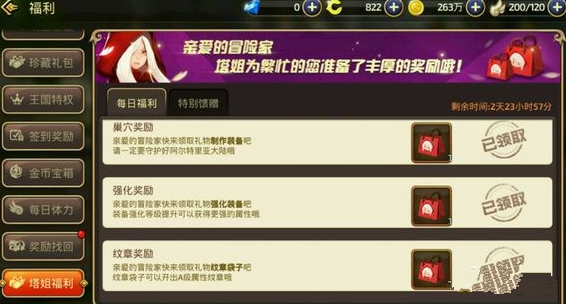 其中有每日福利和特别馈赠,每日福利是可以直接领取的,特别馈赠是需要通关副本或者是天梯、战场或者是积攒获得度才能领取的,奖励非常丰富。