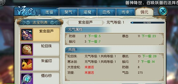 3、法宝铸元要挑着铸,挑一些拥有你需求元气属性法宝,不一定要铸元你的主法宝。
