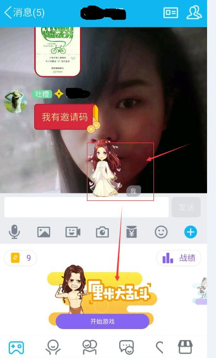 1、第一步,大家打开与好友的聊天窗口,如图点击自己的 厘米秀 就可以看到下面推荐的 厘米大乱斗游戏了。是不是很简单?