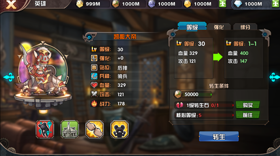 英雄每30级需要进行一次转生才能继续提升等级,转生后大量提升英雄属性,并且等级回到1级,属性不变,转生消耗资源、转生材料,并且核心等级也有限制,具体请在游戏中查看
