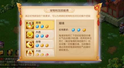 凝魂:鬼魂宠物死亡下回合起每回合增长气血总值20%的魂,若其他单位死亡(触发鬼魂和神佑除外)也会收集一定数量的魂,当收集的魂达到倒地鬼魂宠物的气血值时提前复活。