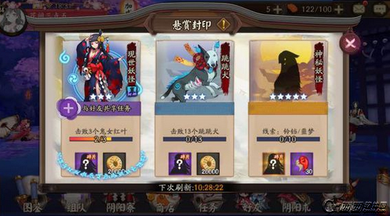 当悬赏封印中出现现世妖怪的任务后,通过现世召唤的界面寻找对应的妖怪击败后即可完成次数