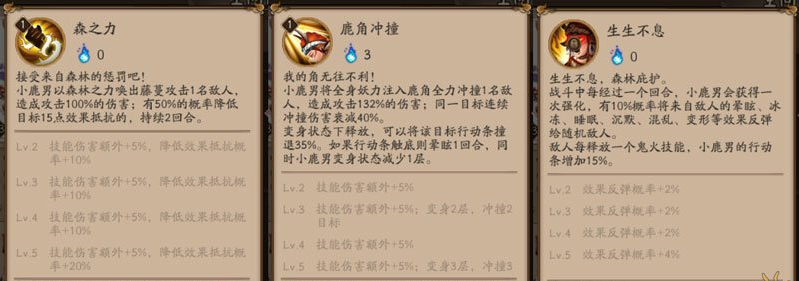 生生不息(觉醒后添加):战斗中每经过一个回合,小鹿男会获得一次强化,有20%概率将来自敌人的晕眩、冰冻、睡眠、沉默、混乱、变形等效果反弹给随机敌人。敌人每择放一个鬼火技能,小鹿男的行动条增加15%。