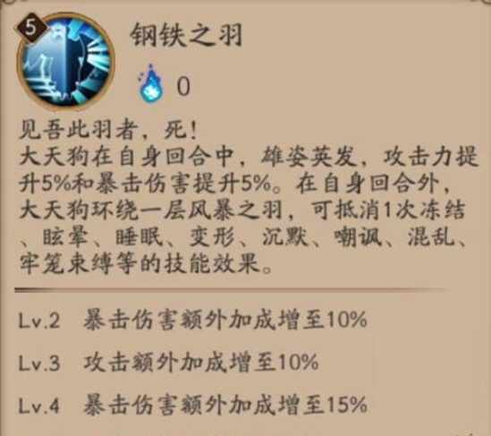 钢铁之羽:大天狗在自身回合中,雄姿英发,攻击力提升15%和暴击伤害提升15%。在自身回合外,大天狗环绕一层风暴之羽,可抵消1次冻结、眩晕、睡眠、变形、沉默、嘲讽、混乱、牢笼束缚等的技能效果。