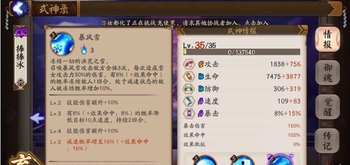 设计师观点:由于雪女在竞技中会给对方不佳的体验,这一点和我们设计回合制游戏你来我往的思路是有所冲突的.我们慎重地决定对[暴风雪]技能进行重新制作。重新制作的雪女将会表现为一个平衡的群控。
