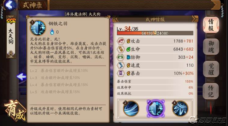 大天狗在自身回合中,雄姿英发,攻击力提升5%和暴击伤害提升5%。在自身回合外,大天狗环绕一层风暴之羽,可抵消1次冻结、眩晕、睡眠、变形、沉默、嘲讽、混乱、牢笼束缚等的技能效果