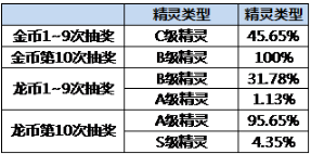 2、稀有的精灵蛋(消耗龙币):前1-9次抽到B级精灵的概率为31.78%,抽到A级精灵的概率为1.13%;第10次抽奖获得A级精灵的概率是95.65%,获得S级精灵的概率是4.35%。