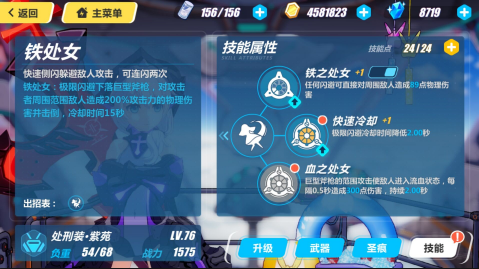 铁处女:极限闪避下落巨型斧枪,对攻击者周围范围敌人造成200%攻击力的物理伤害并击倒,冷却时间15秒