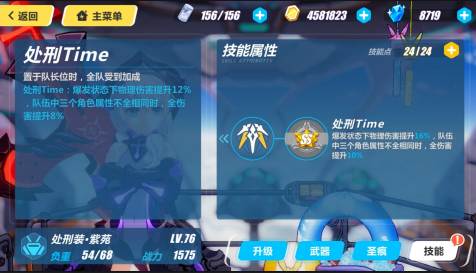 处刑Time:爆发状态下物理伤害提升12%,队伍中三个角色属性不全相同时,全伤害提升8%