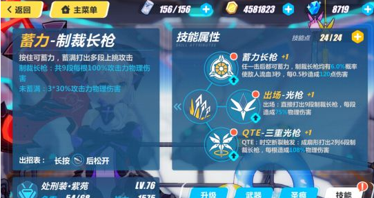 任一击后都可蓄力,制裁长枪均有6%概率使敌人流血3秒,每0.5秒造成120点伤害