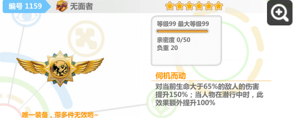 无面者在非潜行状态下,拥有150%的伤害提升,相比于现在的徽章,在这个血量限制下,无面的平均加成低的可怜。在潜行状态下,加成提高到了250%,效果才比较令人满意。在使用中,如果一跳就能造成很高的伤害,那么在无面250%的高加成下,可以一下把敌人打到接近空血甚至直接秒杀,这时的无面拥有较高的加成。因此,无面一般都定义为为了瞬身水晶而生的一击流徽章。