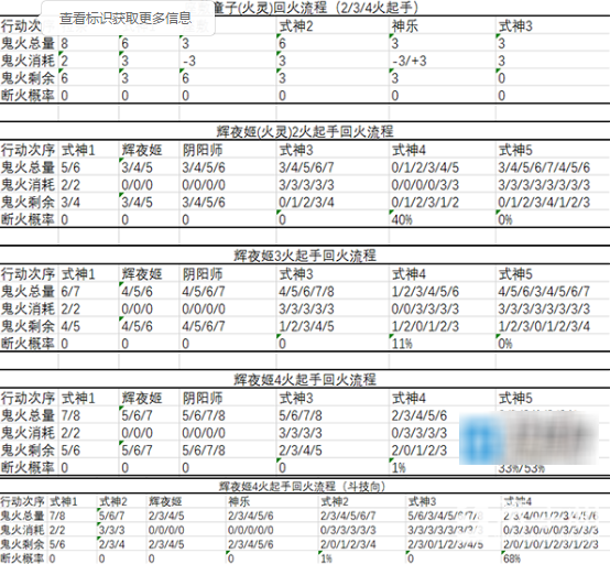 起始2火的战斗:2 火灵3 被动3 技能3 行动5次3(取决于座敷童子速度,一般在两个消耗鬼火的式神之间防止鬼火浪费)= 8 3 3