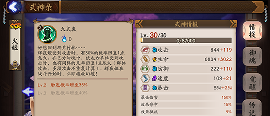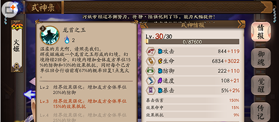 核心技能:辉夜姬的核心技能是给友方开启一个可以提供防御和效果抵抗加成的幻境,并且在幻境中己方单位回合行动前有67%(三分之二)的几率恢复一点鬼火的效果。并且辉夜姬的被动技能火鼠裘同样受到幻境的影响。这个技能升级并不影响恢复鬼火的概率而是提高了防御和效果抵抗的加成。