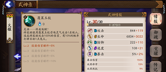 被动技能:被攻击有30%几率回1点鬼火,幻境中同伴被攻击也有同样几率恢复1点鬼火,这个技能和惠比寿的转祸为福一样,但是基础概率就和惠比寿满技能的概率一样都是30%,而辉夜姬的满技能回火概率更高达40%从实战中来看,一个有椒图链子的惠比寿的回火速度完全可以代替打火机,而辉夜姬的回火速度会比惠比寿更快,同时辉夜姬开启幻境之后处于幻境中的每个友方单位都会获得这个效果,并且觉醒后的辉夜姬会在战斗开始就直接释放一次免费的幻境,换句话说有了觉醒的辉夜姬,就相当于每个式神都获得了一个惠比寿的被动回火技能。这个技能对于后手队十分有利。
